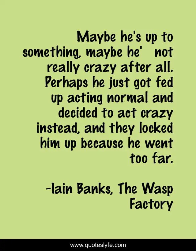 This page presents the quote "Maybe he's up to something, maybe he'ś not really crazy after all. Perhaps he just got fed up acting normal and decided to act crazy instead, and they locked him up because he went too far.". Author of this quote is Iain Banks, The Wasp Factory. .