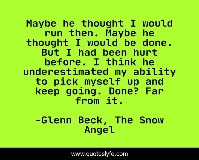 This page presents the quote "Maybe he thought I would run then. Maybe he thought I would be done. But I had been hurt before. I think he underestimated my ability to pick myself up and keep going. Done? Far from it.". Author of this quote is Glenn Beck, The Snow Angel. This quote is about keep-going, never-give-up,.