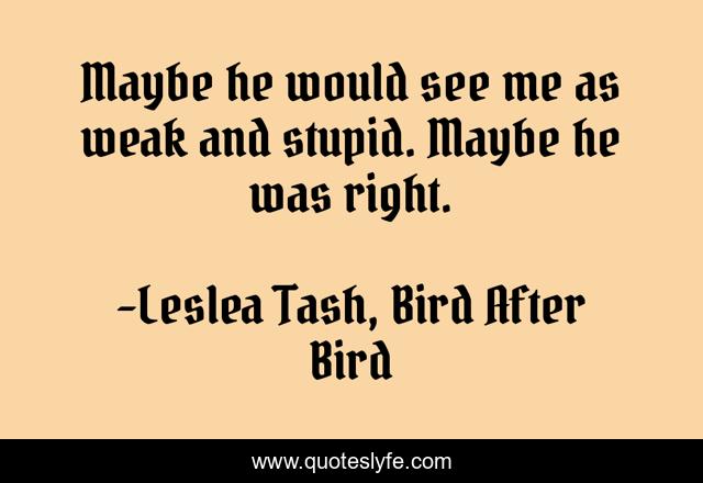 This page presents the quote "Maybe he would see me as weak and stupid. Maybe he was right.". Author of this quote is Leslea Tash, Bird After Bird. This quote is about longing, torn-apart, pain, romance, angst, weakness, weak, contemporary, new-adult,.