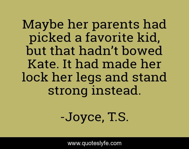 This page presents the quote "Maybe her parents had picked a favorite kid, but that hadn’t bowed Kate. It had made her lock her legs and stand strong instead.". Author of this quote is Joyce, T.S.. This quote is about shifter-romance, self-help,.