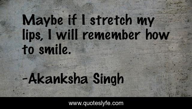 This page presents the quote "Maybe if I stretch my lips, I will remember how to smile.". Author of this quote is Akanksha Singh. This quote is about pain, love, lips, heartbreak, affection, smile, happiness,.