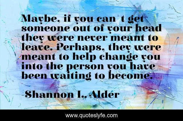 This page presents the quote "Maybe, if you can't get someone out of your head they were never meant to leave. Perhaps, they were meant to help change you into the person you have been waiting to become.". Author of this quote is Shannon L. Alder. This quote is about relationships, faith, faith-in-yourself, love, family, encounters, trusting, hanging-on, aquaintances,.