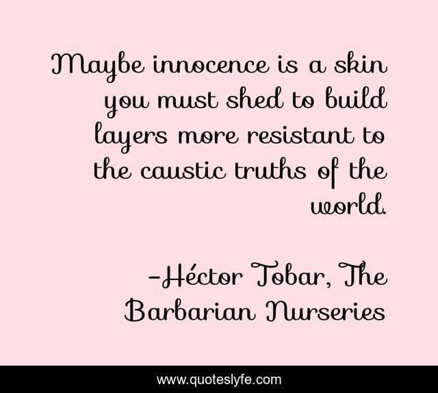 This page presents the quote "Maybe innocence is a skin you must shed to build layers more resistant to the caustic truths of the world.". Author of this quote is Héctor Tobar, The Barbarian Nurseries. This quote is about truth, innocence,.