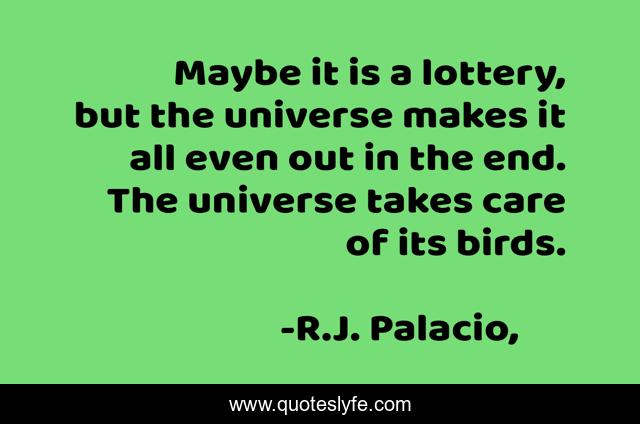 This page presents the quote "Maybe it is a lottery, but the universe makes it all even out in the end. The universe takes care of its birds.". Author of this quote is R.J. Palacio, ワンダー. This quote is about rj-palacio, wonder,.