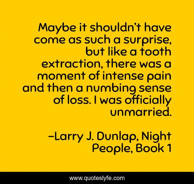 This page presents the quote "Maybe it shouldn’t have come as such a surprise, but like a tooth extraction, there was a moment of intense pain and then a numbing sense of loss. I was officially unmarried.". Author of this quote is Larry J. Dunlap, Night People, Book 1. This quote is about divorce, loss-of-love, emotional-pain,.