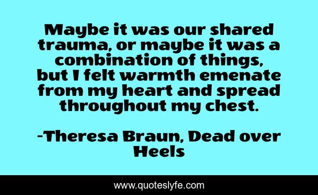 This page presents the quote "Maybe it was our shared trauma, or maybe it was a combination of things, but I felt warmth emenate from my heart and spread throughout my chest.". Author of this quote is Theresa Braun, Dead over Heels. This quote is about heart, love, paranormal, shared-trauma, bonding, trauma, paranormal-romance, traumatic-experiences, warmth,.