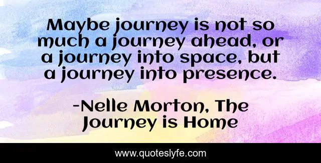 This page presents the quote "Maybe journey is not so much a journey ahead, or a journey into space, but a journey into presence.". Author of this quote is Nelle Morton, The Journey is Home. This quote is about journey, presence,.