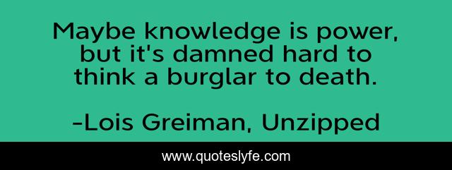 This page presents the quote "Maybe knowledge is power, but it's damned hard to think a burglar to death.". Author of this quote is Lois Greiman, Unzipped. This quote is about mystery, chick-lit, humor,.