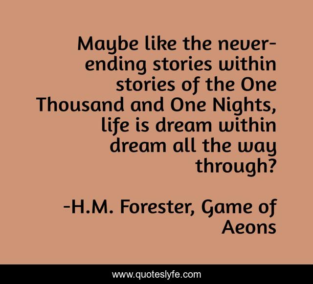 This page presents the quote "Maybe like the never-ending stories within stories of the One Thousand and One Nights, life is dream within dream all the way through?". Author of this quote is H.M. Forester, Game of Aeons. This quote is about stories, dreams,.