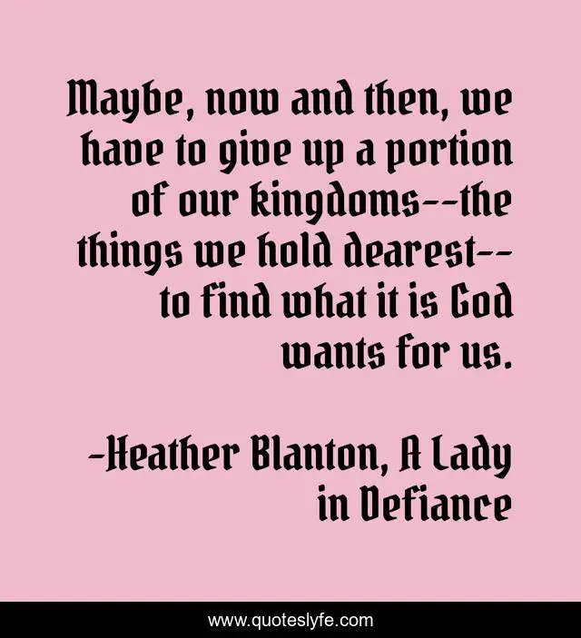 This page presents the quote "Maybe, now and then, we have to give up a portion of our kingdoms--the things we hold dearest--to find what it is God wants for us.". Author of this quote is Heather Blanton, A Lady in Defiance. This quote is about christianity-faith, western-historical-romance, faith-in-god, inspirational, enthusiasm, christian-living,.