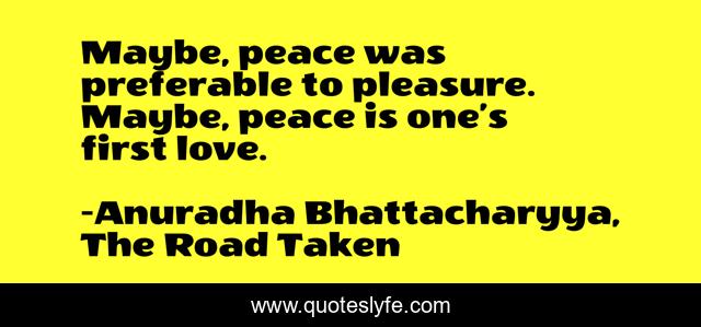This page presents the quote "Maybe, peace was preferable to pleasure. Maybe, peace is one’s first love.". Author of this quote is Anuradha Bhattacharyya, The Road Taken. This quote is about love, peace-on-earth, peace, peace-of-mind, loving-others, affection,.