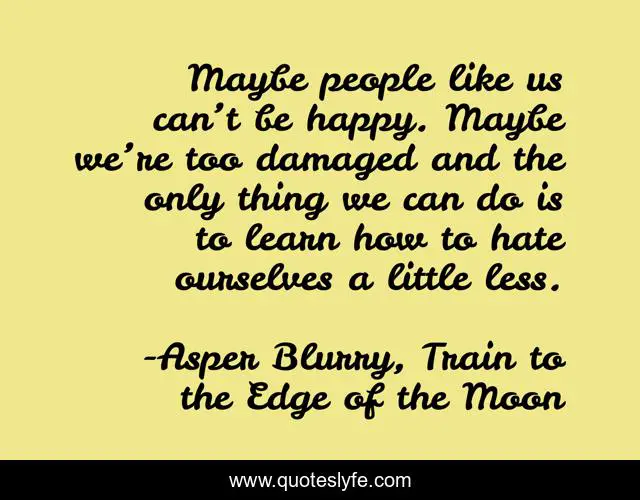 This page presents the quote "Maybe people like us can’t be happy. Maybe we’re too damaged and the only thing we can do is to learn how to hate ourselves a little less.". Author of this quote is Asper Blurry, Train to the Edge of the Moon. This quote is about life, loneliness, fighting-spirit, sadness, inspirational, enthusiasm, hope,.