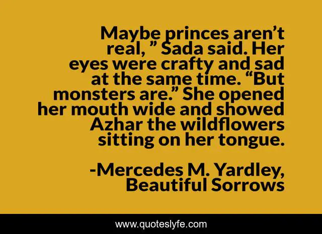 This page presents the quote "Maybe princes aren’t real, ” Sada said. Her eyes were crafty and sad at the same time. “But monsters are.” She opened her mouth wide and showed Azhar the wildflowers sitting on her tongue.". Author of this quote is Mercedes M. Yardley, Beautiful Sorrows. This quote is about dark, fairytales, beautiful-writing,.