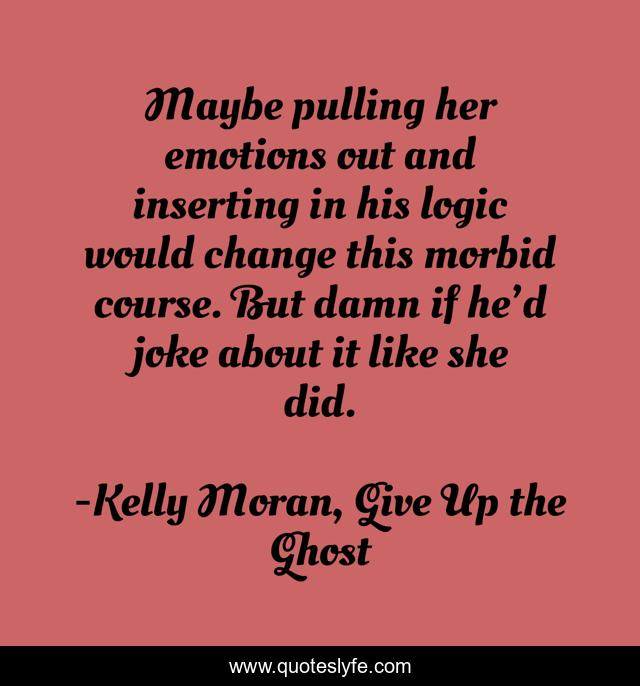 This page presents the quote "Maybe pulling her emotions out and inserting in his logic would change this morbid course. But damn if he’d joke about it like she did.". Author of this quote is Kelly Moran, Give Up the Ghost. This quote is about death, kelly-moran, paranormal, romance, supernatural, ghosts,.