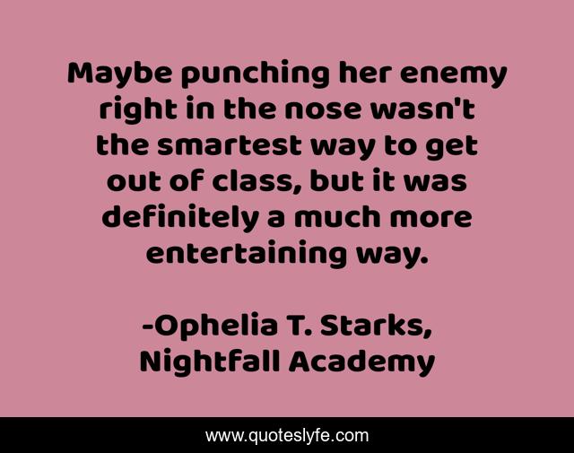This page presents the quote "Maybe punching her enemy right in the nose wasn't the smartest way to get out of class, but it was definitely a much more entertaining way.". Author of this quote is Ophelia T. Starks, Nightfall Academy. This quote is about opening-lines, family,.
