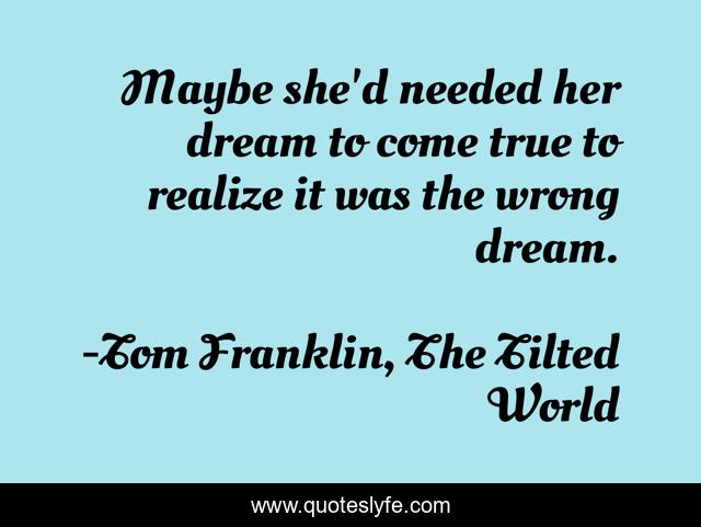This page presents the quote "Maybe she'd needed her dream to come true to realize it was the wrong dream.". Author of this quote is Tom Franklin, The Tilted World. This quote is about thought-provoking, dreams,.