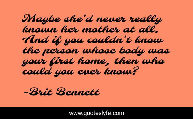 This page presents the quote "Maybe she'd never really known her mother at all. And if you couldn't know the person whose body was your first home, then who could you ever know?". Author of this quote is Brit Bennett. This quote is about family-relationships, mothers-and-daughters, mother,.