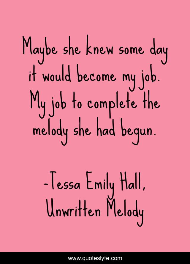 This page presents the quote "Maybe she knew some day it would become my job. My job to complete the melody she had begun.". Author of this quote is Tessa Emily Hall, Unwritten Melody. This quote is about teen-romance, inspirational-fiction, contemporary, ya-romance, music, love-story, realistic-fiction, melody,.