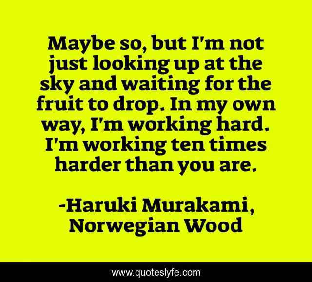 This page presents the quote "Maybe so, but I'm not just looking up at the sky and waiting for the fruit to drop. In my own way, I'm working hard. I'm working ten times harder than you are.". Author of this quote is Haruki Murakami, Norwegian Wood. This quote is about books, book, norwegian-wood,.