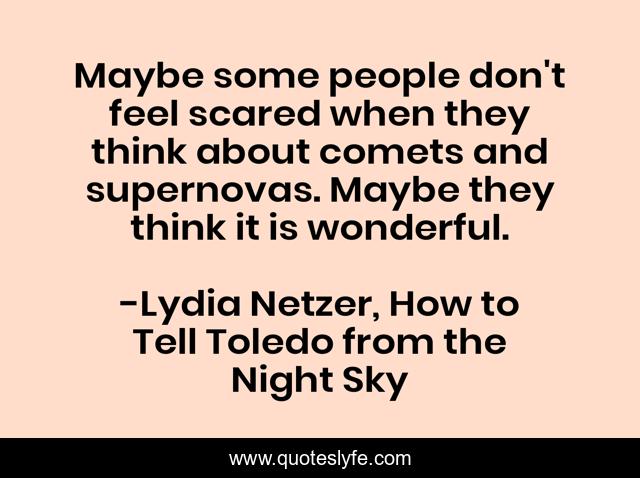 This page presents the quote "Maybe some people don't feel scared when they think about comets and supernovas. Maybe they think it is wonderful.". Author of this quote is Lydia Netzer, How to Tell Toledo from the Night Sky. This quote is about comets, astronomy, stars,.