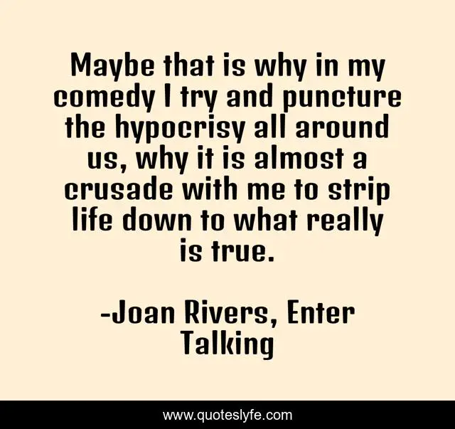 This page presents the quote "Maybe that is why in my comedy I try and puncture the hypocrisy all around us, why it is almost a crusade with me to strip life down to what really is true.". Author of this quote is Joan Rivers, Enter Talking. This quote is about humour, performers, writing, brooklyn, nyc, comedy,.