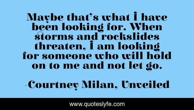 This page presents the quote "Maybe that’s what I have been looking for. When storms and rockslides threaten, I am looking for someone who will hold on to me and not let go.". Author of this quote is Courtney Milan, Unveiled. This quote is about love, never-let-go, rockslide, courtney-milan, romance, hold-on, devotion, affection,.