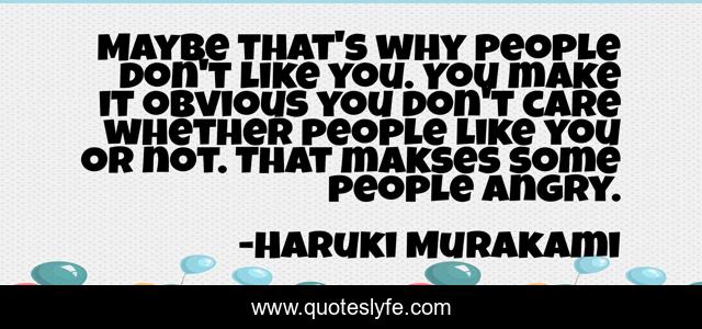 This page presents the quote "Maybe that's why people don't like you. You make it obvious you don't care whether people like you or not. That makses some people angry.". Author of this quote is Haruki Murakami. This quote is about life, personality,.