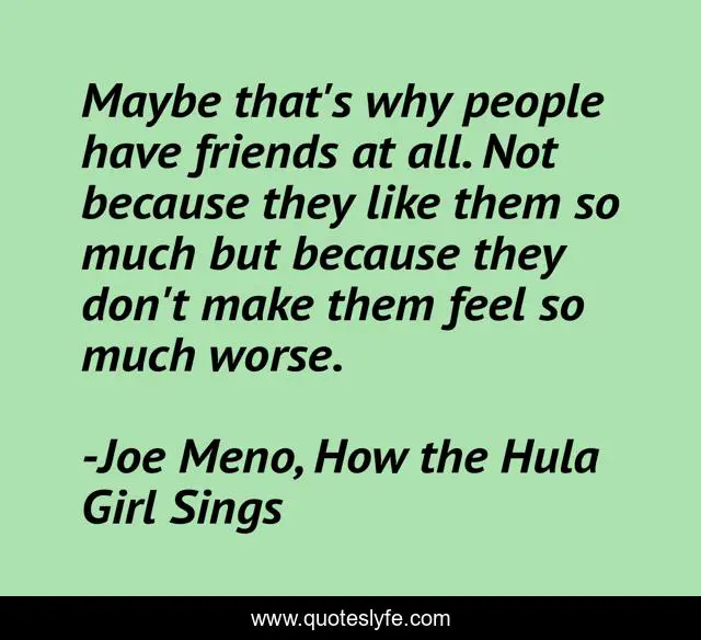 This page presents the quote "Maybe that's why people have friends at all. Not because they like them so much but because they don't make them feel so much worse.". Author of this quote is Joe Meno, How the Hula Girl Sings. .