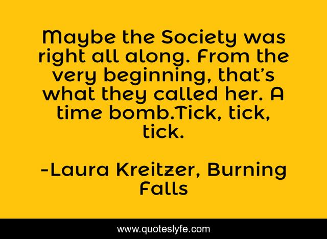 This page presents the quote "Maybe the Society was right all along. From the very beginning, that’s what they called her. A time bomb.Tick, tick, tick.". Author of this quote is Laura Kreitzer, Burning Falls. This quote is about love, dystopian, ya, science-fiction, romance, burning-falls, summer-chronicles, young-adult, affection,.