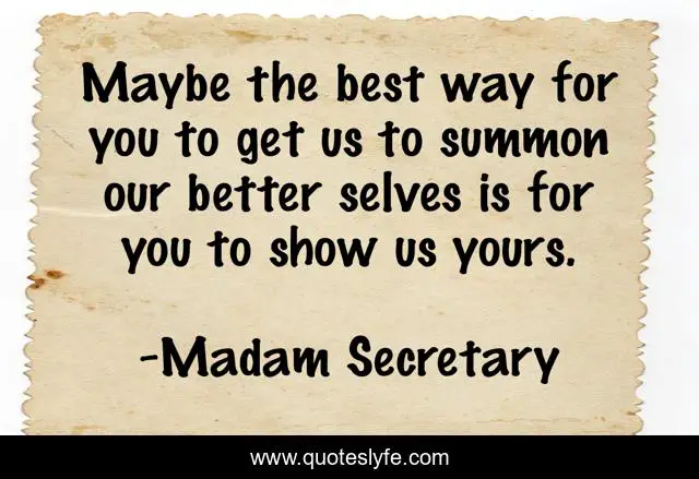 This page presents the quote "Maybe the best way for you to get us to summon our better selves is for you to show us yours.". Author of this quote is Madam Secretary. This quote is about testimony, authenticity, example, transparency, humility,.