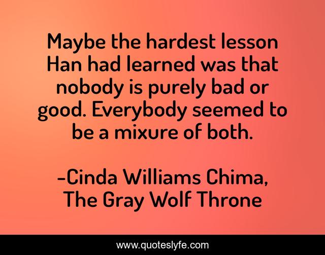 This page presents the quote "Maybe the hardest lesson Han had learned was that nobody is purely bad or good. Everybody seemed to be a mixure of both.". Author of this quote is Cinda Williams Chima, The Gray Wolf Throne. .