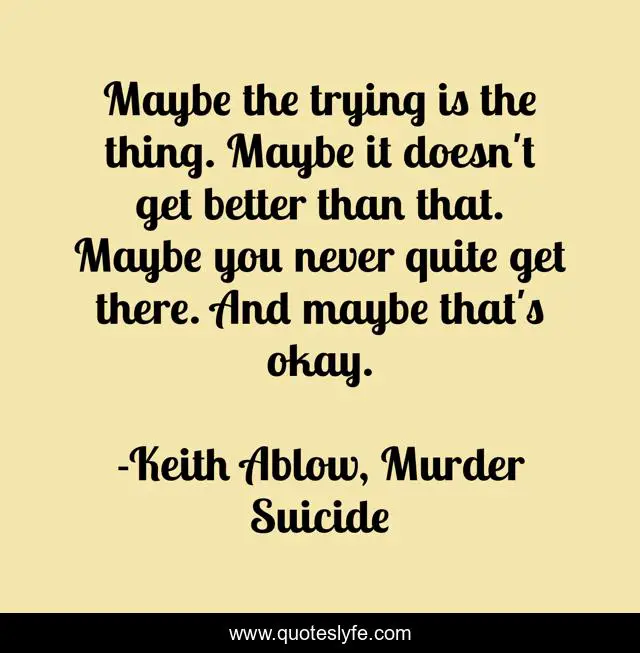 This page presents the quote "Maybe the trying is the thing. Maybe it doesn't get better than that. Maybe you never quite get there. And maybe that's okay.". Author of this quote is Keith Ablow, Murder Suicide. .