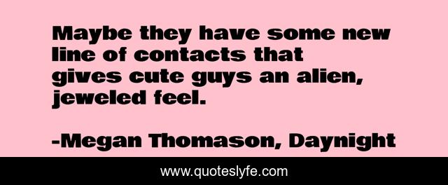 This page presents the quote "Maybe they have some new line of contacts that gives cute guys an alien, jeweled feel.". Author of this quote is Megan Thomason, Daynight. This quote is about alien, cute, jewel,.