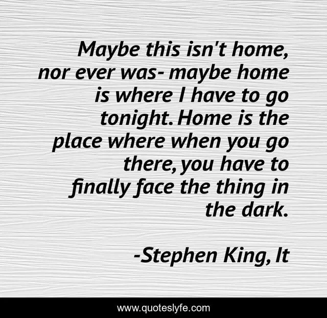 This page presents the quote "Maybe this isn't home, nor ever was- maybe home is where I have to go tonight. Home is the place where when you go there, you have to finally face the thing in the dark.". Author of this quote is Stephen King, It. This quote is about home, horror, coming-home, derry,.