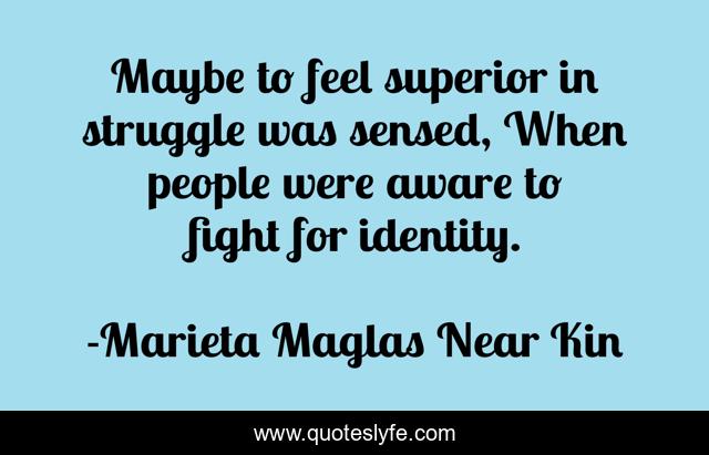 This page presents the quote "Maybe to feel superior in struggle was sensed, When people were aware to fight for identity.". Author of this quote is Marieta Maglas Near Kin. This quote is about people, feelings, superiority, struggle, sense, identity, awareness,.