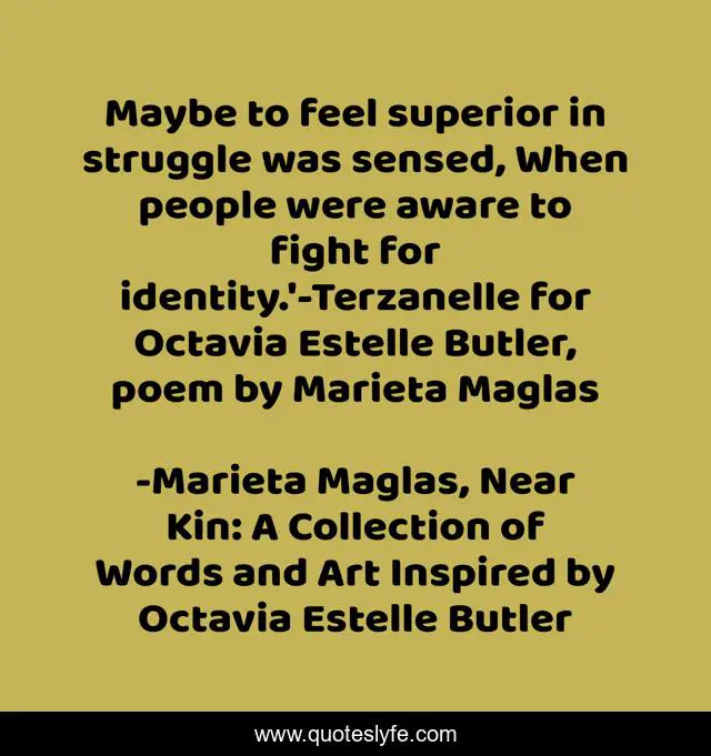 This page presents the quote "Maybe to feel superior in struggle was sensed, When people were aware to fight for identity.'-Terzanelle for Octavia Estelle Butler, poem by Marieta Maglas". Author of this quote is Marieta Maglas, Near Kin: A Collection of Words and Art Inspired by Octavia Estelle Butler. This quote is about superior, people, feelings, struggle, sense, identity, awareness,.