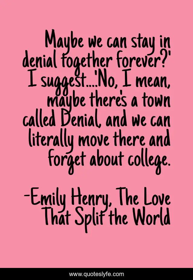 This page presents the quote "Maybe we can stay in denial together forever?' I suggest....'No, I mean, maybe there's a town called Denial, and we can literally move there and forget about college.". Author of this quote is Emily Henry, The Love That Split the World. This quote is about denial, bestfriend,.
