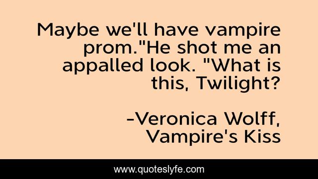 This page presents the quote "Maybe we'll have vampire prom."He shot me an appalled look. "What is this, Twilight?". Author of this quote is Veronica Wolff, Vampire's Kiss. This quote is about prom, vampires,.