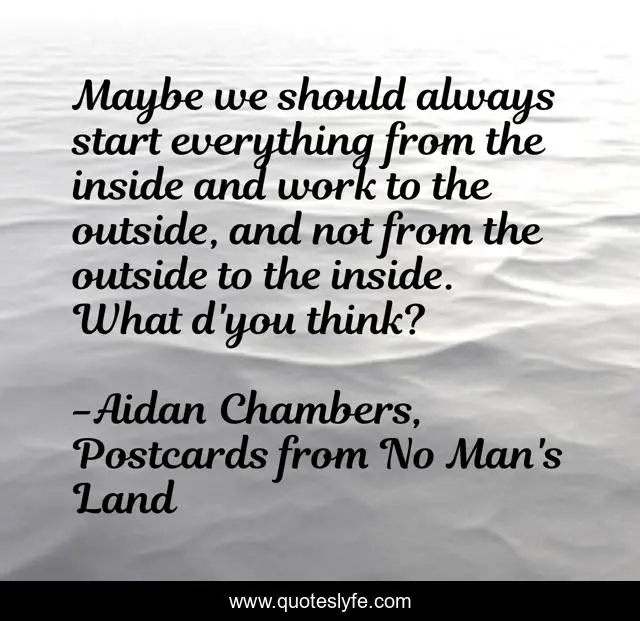 This page presents the quote "Maybe we should always start everything from the inside and work to the outside, and not from the outside to the inside. What d'you think?". Author of this quote is Aidan Chambers, Postcards from No Man's Land. This quote is about life, philosophy, questions,.