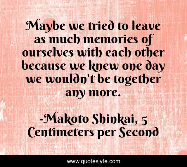 This page presents the quote "Maybe we tried to leave as much memories of ourselves with each other because we knew one day we wouldn't be together any more.". Author of this quote is Makoto Shinkai, 5 Centimeters per Second. This quote is about anxiety, moving-forward, separation-anxiety, first-love, heartbreak, separation, moving-on,.