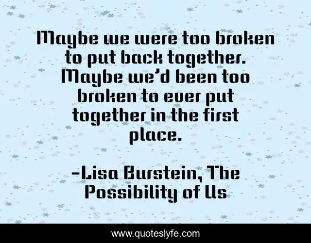 "Lisa Burstein, The Possibility of Us Quotes." Quoteslyfe.com, 2025. Sat. 06 Dec. 2025. <https://www.quoteslyfe.com/quote/Maybe-we-were-too-broken-to-put-232502>.