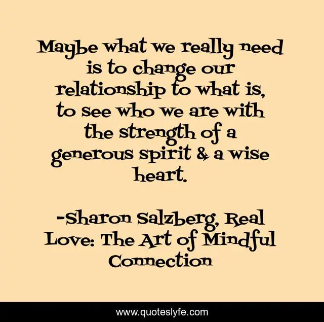 This page presents the quote "Maybe what we really need is to change our relationship to what is, to see who we are with the strength of a generous spirit & a wise heart.". Author of this quote is Sharon Salzberg, Real Love: The Art of Mindful Connection. This quote is about relationships, love, mindfulness, communication, wisdom, buddhism, affection,.