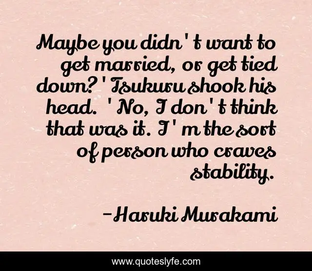 This page presents the quote "Maybe you didn't want to get married, or get tied down?'Tsukuru shook his head. 'No, I don't think that was it. I'm the sort of person who craves stability.". Author of this quote is Haruki Murakami. This quote is about stability, married, relationship, murakami,.