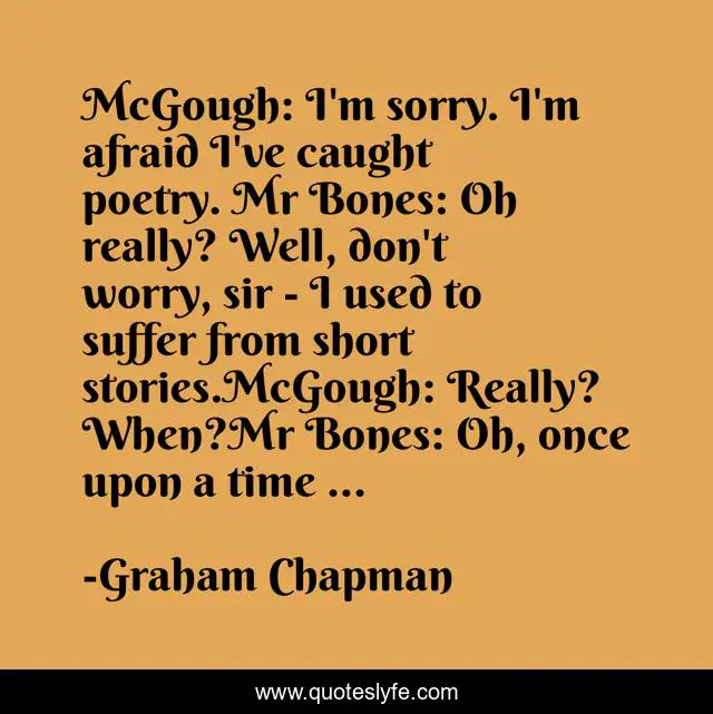 This page presents the quote "McGough: I'm sorry. I'm afraid I've caught poetry. Mr Bones: Oh really? Well, don't worry, sir - I used to suffer from short stories.McGough: Really? When?Mr Bones: Oh, once upon a time ...". Author of this quote is Graham Chapman. This quote is about humor, poetry,.