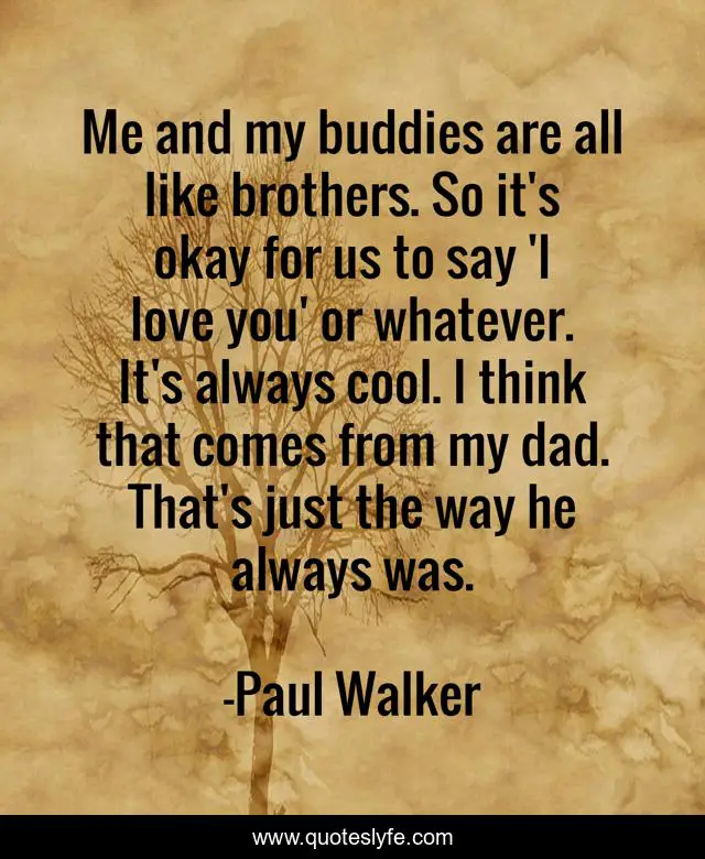 This page presents the quote "Me and my buddies are all like brothers. So it's okay for us to say 'I love you' or whatever. It's always cool. I think that comes from my dad. That's just the way he always was.". Author of this quote is Paul Walker. This quote is about i love you, me, love, affection,.