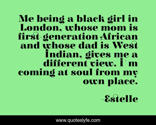 This page presents the quote "Me being a black girl in London, whose mom is first-generation African and whose dad is West Indian, gives me a different view. I'm coming at soul from my own place.". Author of this quote is Estelle. This quote is about me, girl, soul,.