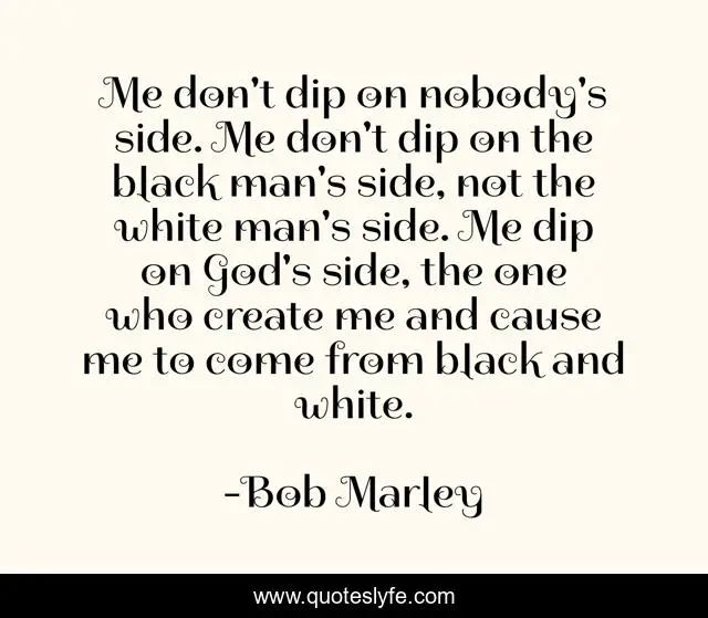 This page presents the quote "Me don't dip on nobody's side. Me don't dip on the black man's side, not the white man's side. Me dip on God's side, the one who create me and cause me to come from black and white.". Author of this quote is Bob Marley. This quote is about me, black and white, man,.