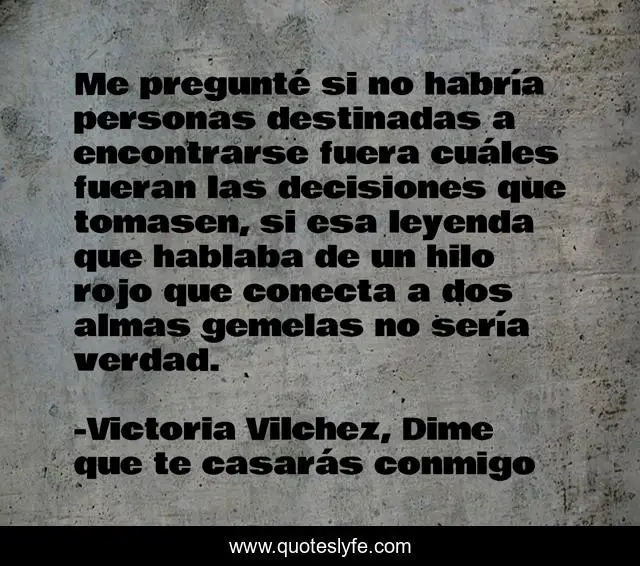 This page presents the quote "Me pregunté si no habría personas destinadas a encontrarse fuera cuáles fueran las decisiones que tomasen, si esa leyenda que hablaba de un hilo rojo que conecta a dos almas gemelas no sería verdad.". Author of this quote is Victoria Vilchez, Dime que te casarás conmigo. This quote is about new-adult, romance, romántica,.