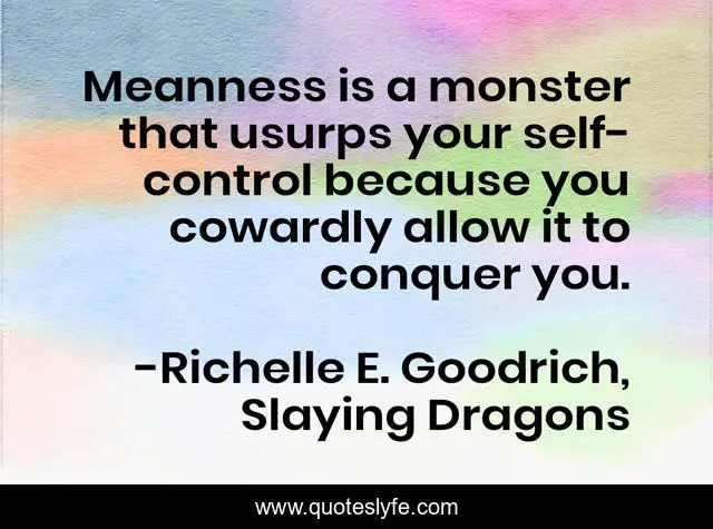 This page presents the quote "Meanness is a monster that usurps your self-control because you cowardly allow it to conquer you.". Author of this quote is Richelle E. Goodrich, Slaying Dragons. This quote is about richelle-e-goodrich, meanness, unkindness, richelle, self-control, richelle-goodrich, being-mean, mean,.