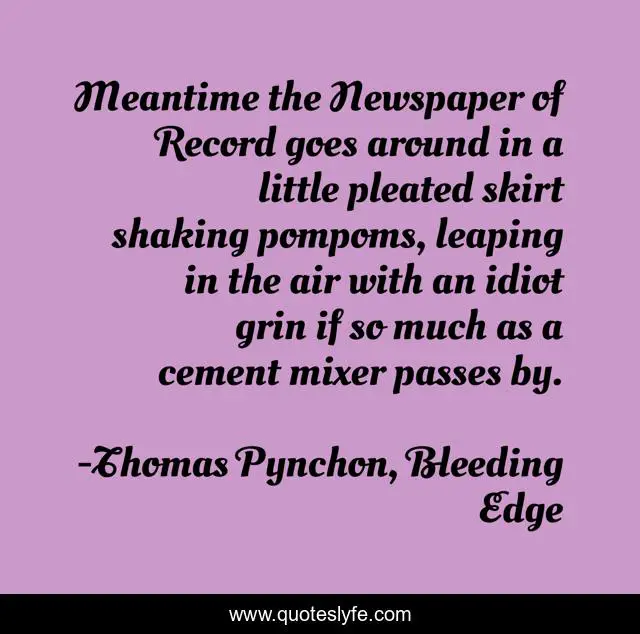 This page presents the quote "Meantime the Newspaper of Record goes around in a little pleated skirt shaking pompoms, leaping in the air with an idiot grin if so much as a cement mixer passes by.". Author of this quote is Thomas Pynchon, Bleeding Edge. This quote is about new-york-times, new-york-city, journalism,.